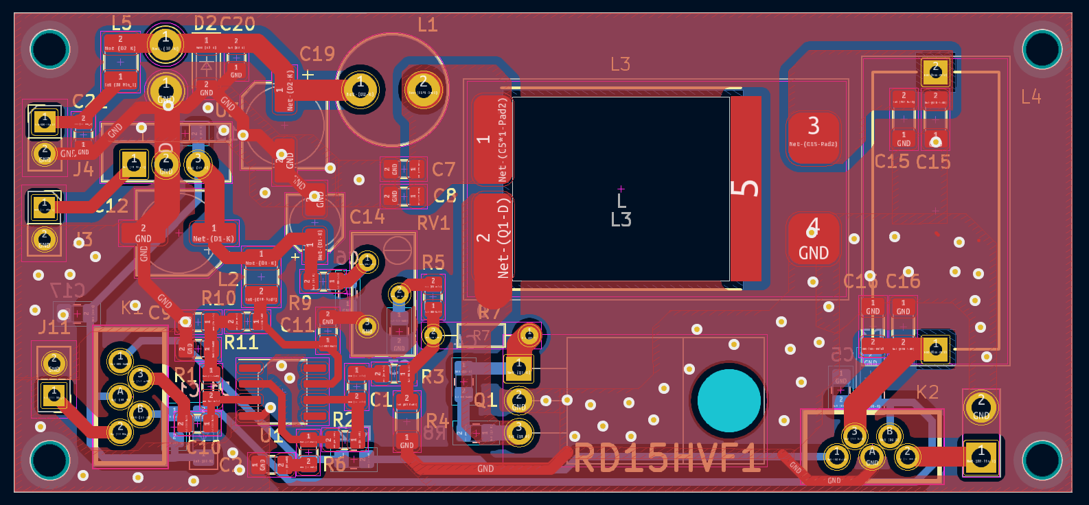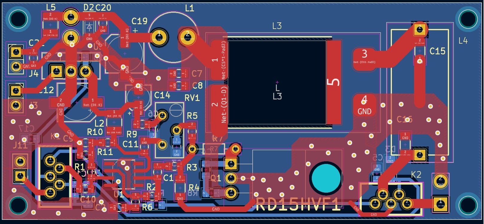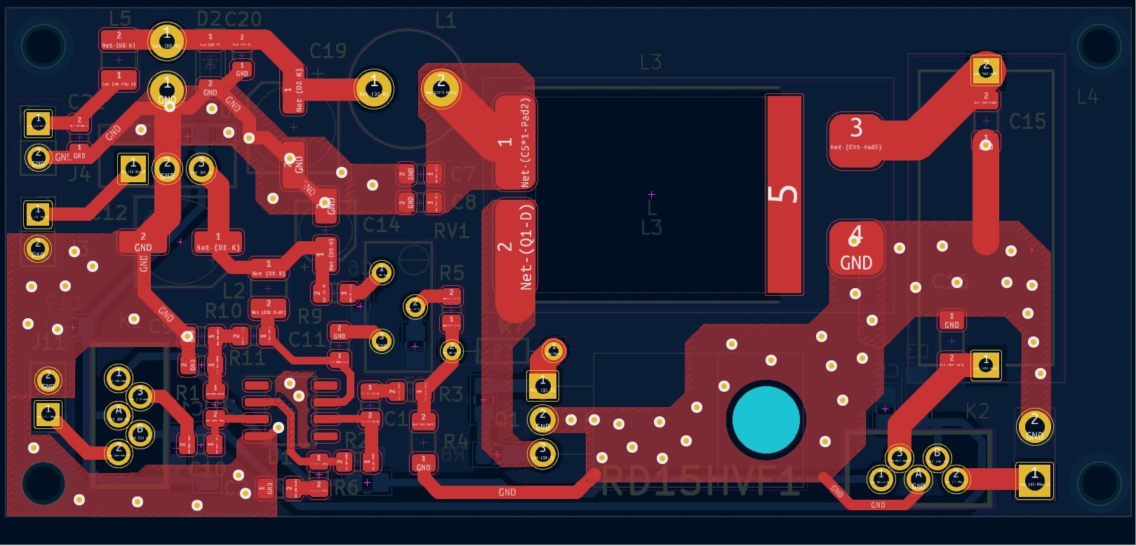 UR5FFR Я би зробив суцільну землю не тільки знизу але й зверху. І багато перехідних отворів щоб її з'єднати 788.png ось як варіант імхо переходи треба розподілити рівномірно, а не хаотично їх натикати... он зверху їх майже нема.. Зробіть більший відступ від доріжок, щоб зникли оті ост...