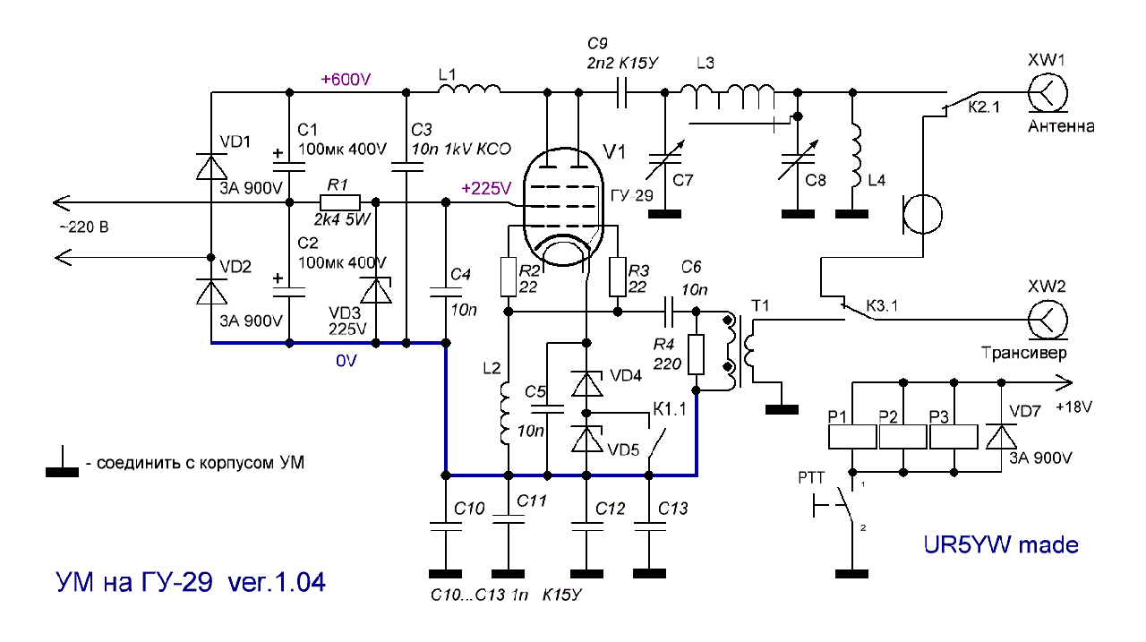 А чому б не спробувати варіант з безтрансформаторним живленням на телевізійних лампах у двотакті. Наприклад, 6п44с, дуже компактна лампа, можна купити нову недорого,якщо в тумбочці нема,панельки теж. Колеги, котрі ставили дві 6п44с паралельно замість оригінальних в KENWOOD TS-520...830 cтверджують,що мали не менше 100вт.правда при анодній напрузі більше 800в. Дві 6п44с займуть місця майже стільки як одна гу29 і, наостанок, трансивер буде повністю на лампах із старого телевізора
