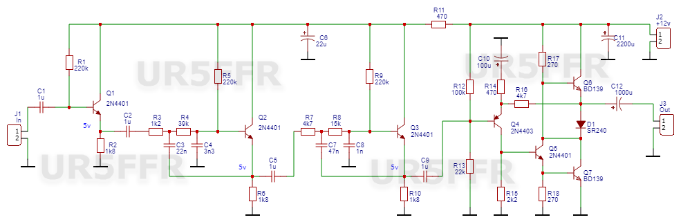 Підсилювач низької частотиНа транзисторах Q2Q3 зроблено ФНЧ з частотою зрізу 3кГц, на Q4Q5Q6Q7 - підсилювач потужності. Схема дещо не зовсім звичайна. Кому цікаво дивимося журнал Радіо №5 1978 ст.42, №9 1982 ст.43. Струм спокою виставляти не треба. Вся плата споживає приблизно 30мА.