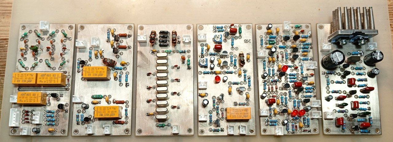 Прогрес по проекту. Зліва направо: BPF, Атенюатор+ПВЧ, змішувач+КФ, SSB модулятор, ППЧ+АРП, ПНЧ