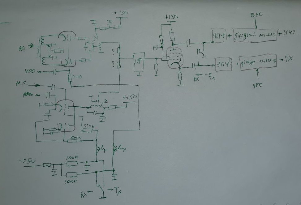 Міксери, які дав Андрій використати наступним чином: лівий на схемі на приймання, має 50 Ом по входу,і має низький опір по гетеродину, правий на передачу. Далі КФ та УПЧ (спільні на прийом к передачу) і потім два міксери на діодах. Вони теж низькоомні, думаю узгодити буде не важко. Комутація навколо КФ і УПЧ. Гетеродини не комутуються, ГПД йде на ламповий і діодний і опора йде на ламповий і діодний.