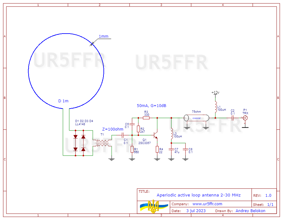 Підсилювач з коробкою викидати було шкода тому вирішив трохи побавитися - на скору руку зробив рамку діаметром 1 метр, та підключив до неї підсилювач через балун, щоб придушити синфазну складову. Поганяв по діапазонах - дуже непогана аперіодична КХ антена вийшла. На 80ці вона програє резонансній рамці, особливо коли ввімкнули вуличне освітлення - треба буде поміркувати над цим питанням. Але на 40м/20м різниці майже нема. Схема дуже проста
