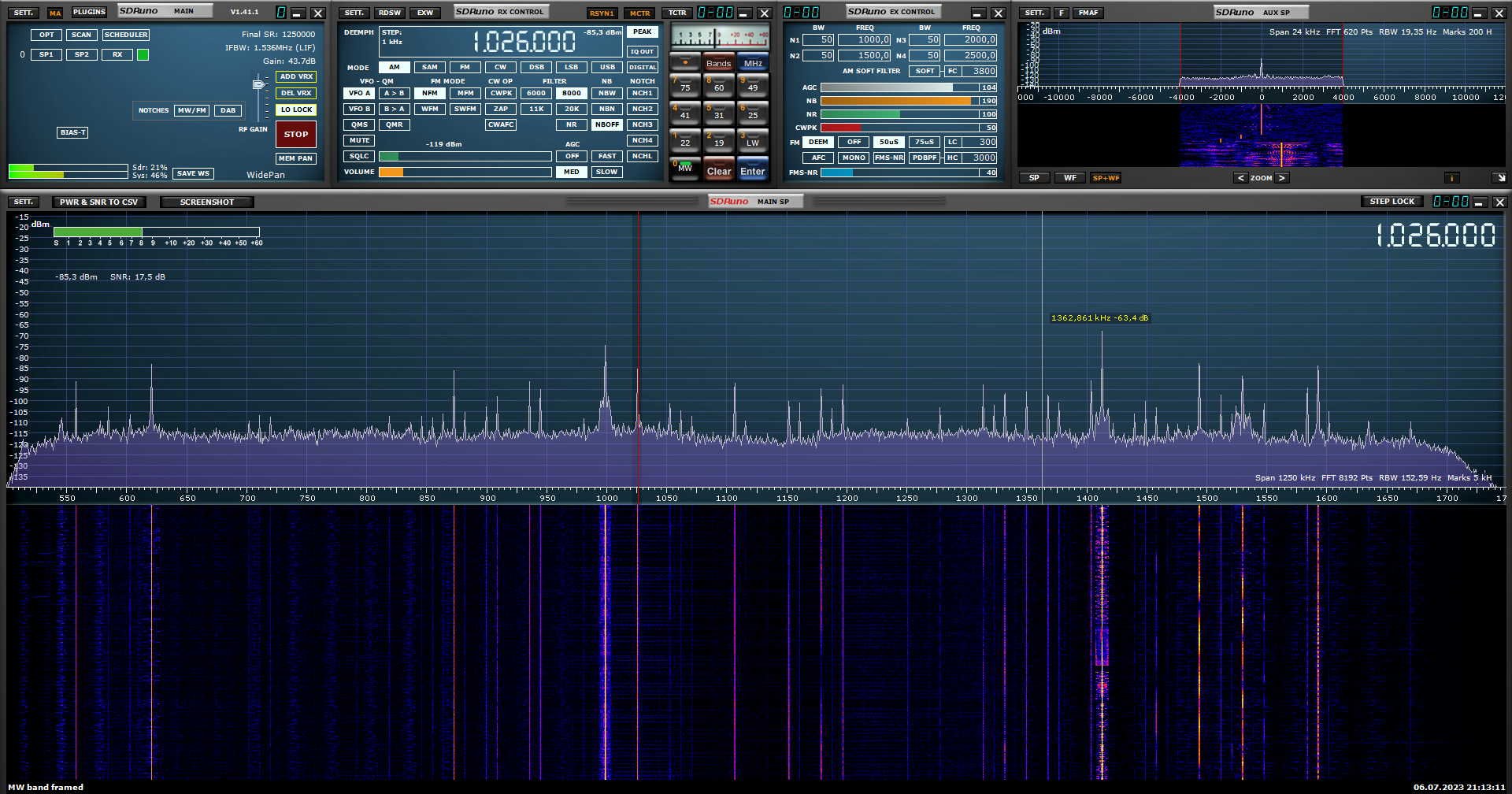 Не дивлячись на те що антенна начебто НЧ. На 15М був гарний прохід. Назбирав треків FT8 моди на RSP1 клон, без смугових фільтрів на вході, 06-07 липня 2023, мій локатор JN58TC: