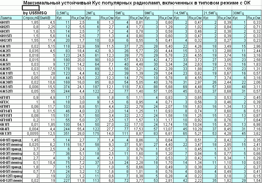 Таблиця по максимальному підсиленню ламп від US5MSQ