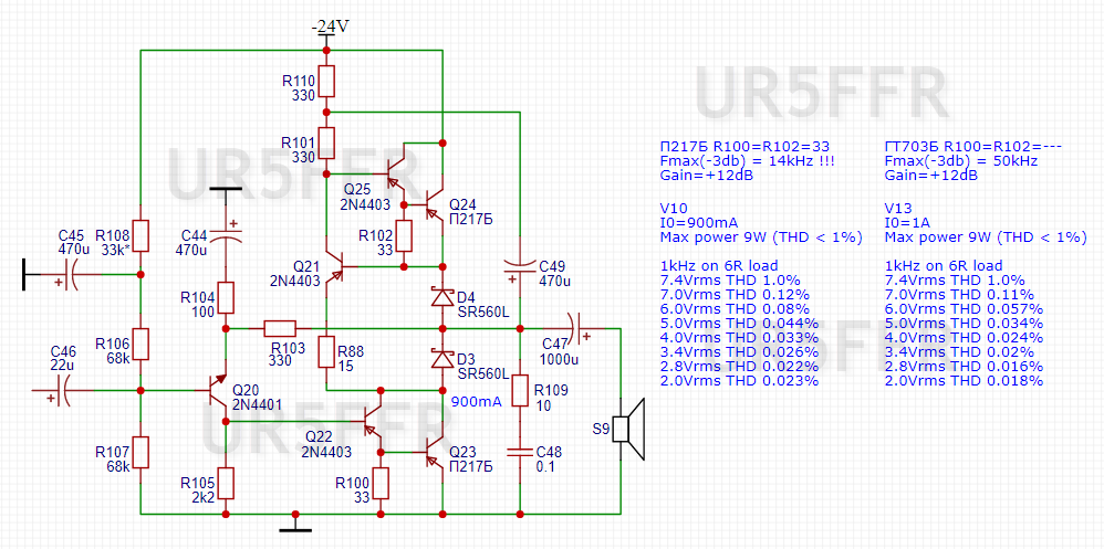 Довелося у вихідному каскаді використовувати складові транзистори по схемі Дарлінгтона, бо інакше суттєво зменшується максимальна вихідна потужність через низьку бетту силових транзисторів. С56С57 потрібно бо інакше є самозбудження на ультразвуку. У КТ837 дуже брудний спектр. КТ818 від нього не далеко відійшов.