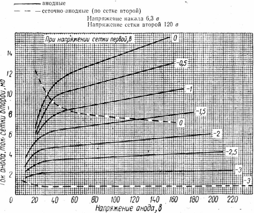 АРП вимкнено, вхідні сигнали відсутні: Ug2=105B, Ug1=-1.5B (може трошки відрізнятись залежно від напруги встановленої резистором R4-5). На вхідних характеристиках бачимо, що лампа працює з близькою до максимальної крутизною. Але струм екранної сітки не близько 3мА, а (220-105)/51кОм=2.25мА, що зрозуміло, бо наша екранна напруга не 120В, а 105. Для себе відмічаємо, що без впровадженого дільника напруги АРП вона становить -2.5...3В при якій крутизна суттєво менша. На анодних характеристиках бачимо, що робоча точка влучила в зону де очікуються симетричні зміни анодного струму під впливом обох півхвиль вхідного сигналу.