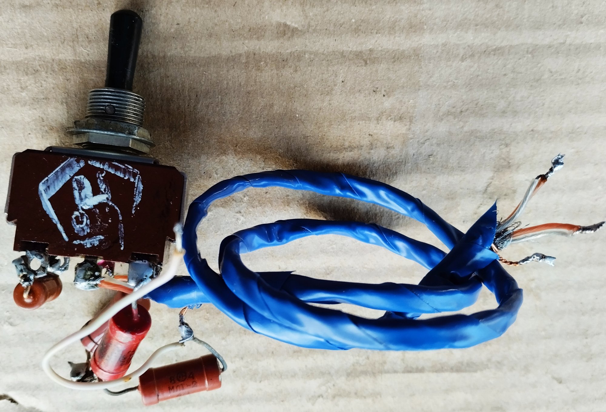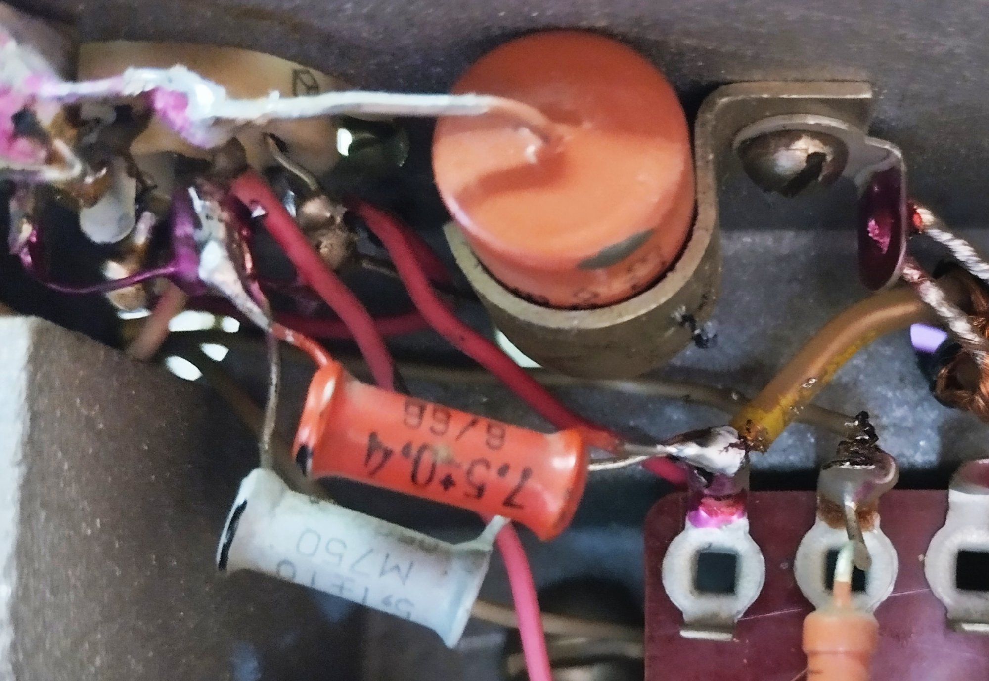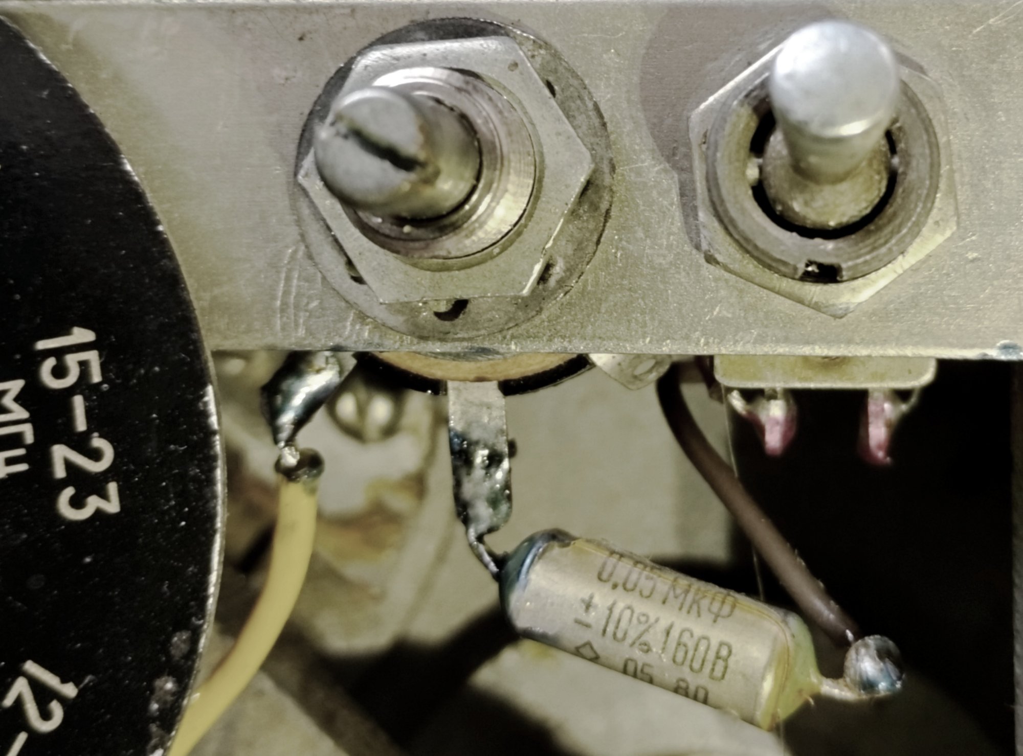 Елементи цього аттенюатора у вигляді чомусь 2-ватних резисторів МЛТ (мабуть тільки для додаткового збільшення паразитної ємності на землю) змонтовані на самому тумблері. Вилучення цього ‟покращення‟ і відновлення оригінальної схеми відразу допомогло, приймач почав глибше дихати і на вч-діапазонах. Ось так виглядає те що стояло: Від перемикача контролю струмів помітні дроти які йдуть під кришку правого борту. Знімаю її і бачу у відсіку лампи 1-го каскаду УНЧ Л3-4 купу додаткових елементів з’єднаних за якоюсь складною схемою навісним монтажем який весь тримається на двох гнучких тонких дротах, а вся ця купа у небезпечному місці ізольована від штатних елементів шматком поролону. Здається це вимірювач нч-напруги який, треба визнати, непогано працював, стрілка індикатора поводила себе цілком адекватно. Але, все одно — нαχερ з пляжу!, бо я й так вже дуже злий і роздратований. Ось воно: Ну, і найгірше це третє: у положенні перемикача смуги ‟1.5‟ вона відчувається ширшою ніж у положенні ‟6‟, а у положенні ‟6‟ здається вужчою ніж має бути. Знімаємо кришку лівого борту, а тут взагалі повний капець: у двох відсіках відкусані штатні елементи, резистори і конденсатори фільтру основної селекції. Всі ті конденсатори, які на схемі марковані зіркою, тобто ті, номінали яких під час заводського регулювання ретельно підбираються. Деякі просто висять у повітрі, до деяких послідовно додані різнокольорові конденсатори. Дивіться: Особливо милуюся конденсатором зеленого кольору, для пустелі Сахара — саме те. На щастя, довжина відводів усіх елементів що були відкусані виявилася достатньою для відновлення оригінальної схеми і все стало на свої рідні місця.