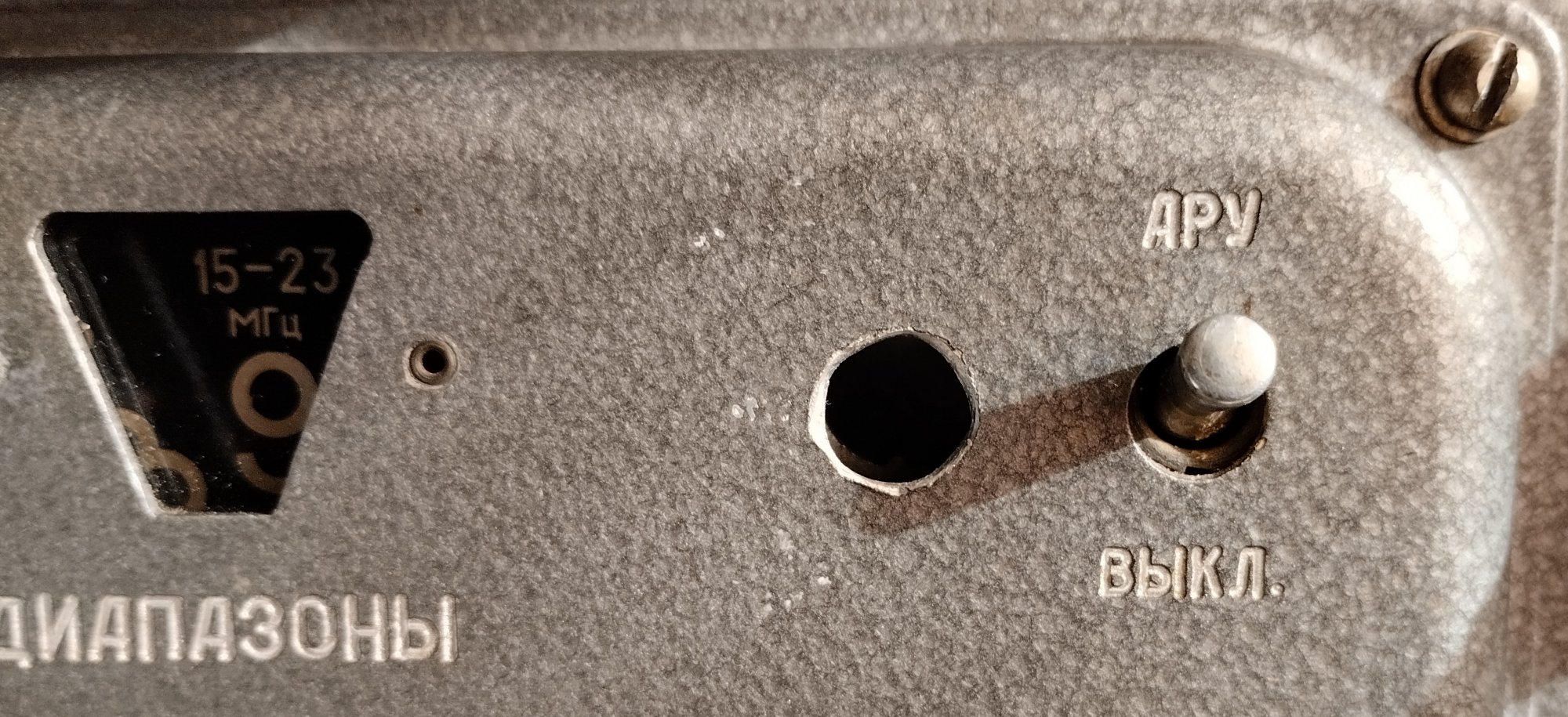 Для цієї частини мав би бути поетичний епіграф ‟слєсарєй харошьіх мало, остальньім πι...Δα настала.‟, бо майстер який зробив отвір у передній кришці був ςρακοруким слюсарем: зроблено не співвісно із штатним отвором внутрішньої тумблерної планки і нібито трикутним свердлом. Спотворений вигляд передньої панелі дуже дратує, шукаю іншу кришку. Поки її немає вирішив цю дірку (інакше не назвеш) тимчасово затулити якось із користю. Розглядав додавання аттенюатора (знову), або обмежувача імпульсних перешкод. Для втілення цього треба тягнути дроти у схему. Крім того, стосовно ретро я є стійким і переконаним Свідком Секти Зовнішнього Аттенюатора. Можна було б встановити перемикача константи АРП, але не вважаю це дуже необхідним.