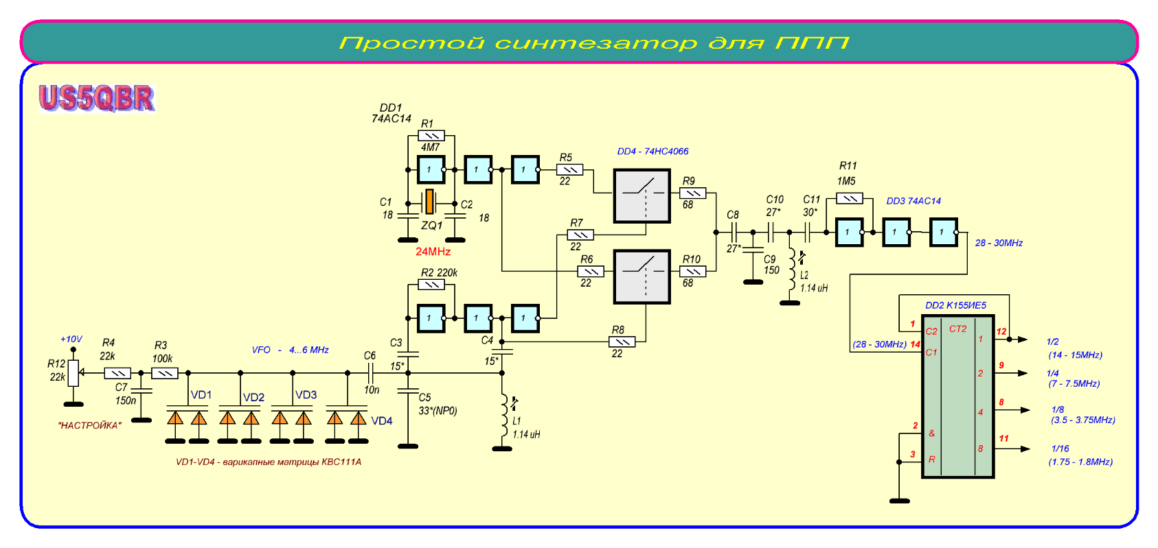 Цікава схема коли використовуємо лише параметричну стабілізацію частоти бо гетеродин завжди працює на відносно низький частоті 4-6МГц. Але якщо задіяти ЦАПЧ у будь якому вигляді то підставку робити не треба - гетеродин може працювати одразу на потрібній частоті. Наприклад у мене він працює у діапазоні 60-120МГц і частота стоїть як укопана.