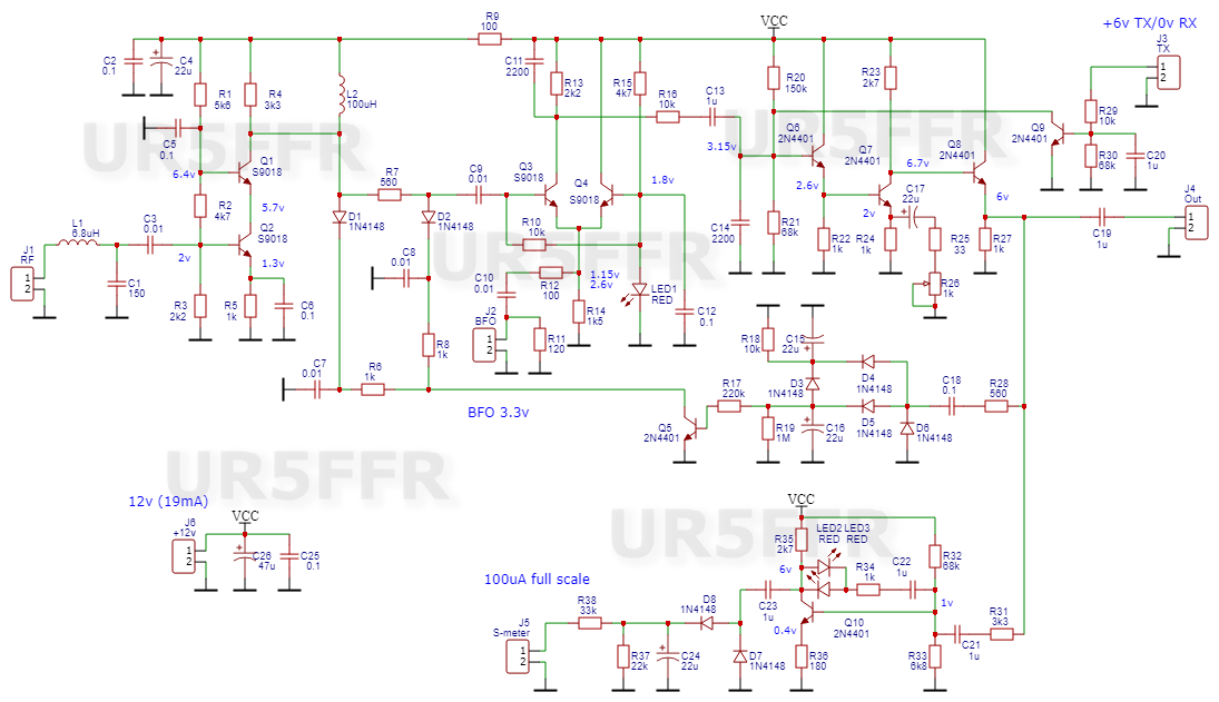 - Добавлено детектор S-метра на Q10. Якщо знімати сигнал після детектору АРП з конденсатора C18 то при сигналах менших ніж рівень спрацювання АРП стрілка S-метра буде на нулі. Тому зроблено окремий підсилювач сигналу на Q10. Далі сигнал випрямляється та усереднюється на конденсаторі C24. Вихід S-метра можна підключити до АЦП синтезатора або безпосередньо до мікроамперметра. Калібрувати шкалу S-метра не має сенсу бо при зміні підсилення R26 шкала буде невірна. Але показання цього псевдо-S-метра мають сенс, бо він показує рівень сигналу відносно порога спрацьовування системи АРП. Цей поріг при вказаних номіналах та індикатору на 100uA находиться приблизно на позначці 70uA. Якщо стрілка зліва цієї відмітки то АРП не працює бо сигнал занадто  слабкий. Якщо більше то АРП працює та обмежує рівень сигналу. R38 треба підібрати до відхилення стрілки індикатора на повну шкалу.