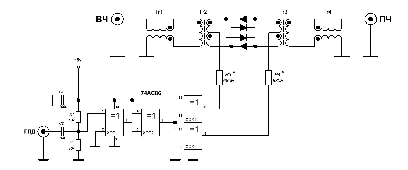 - раніше часто використовував із синтезатором такий простий  діодний змішувач. було велике бажання спробувати змішувач на польових 310 тр. Андрій ви не випробували подібний?  73!