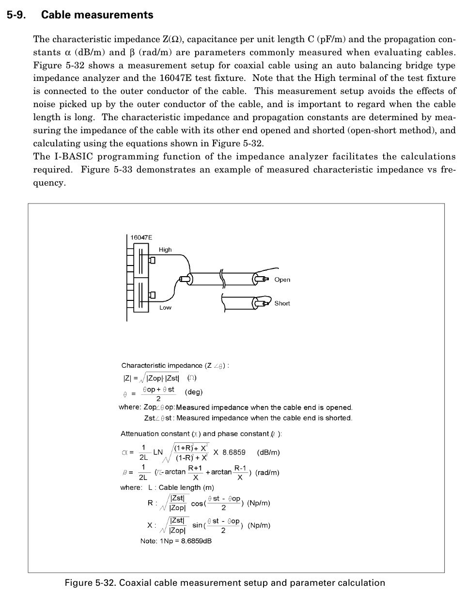 Якщо є векторний аналізатор, то вимір параметрів кабелю суттєво спрощується. Необхідно взяти відрізок кабелю та виміряти його комплексний імпеданс при розімкнутому та закороченому кінці. Далі використовуємо формули з апноуту Agilent.