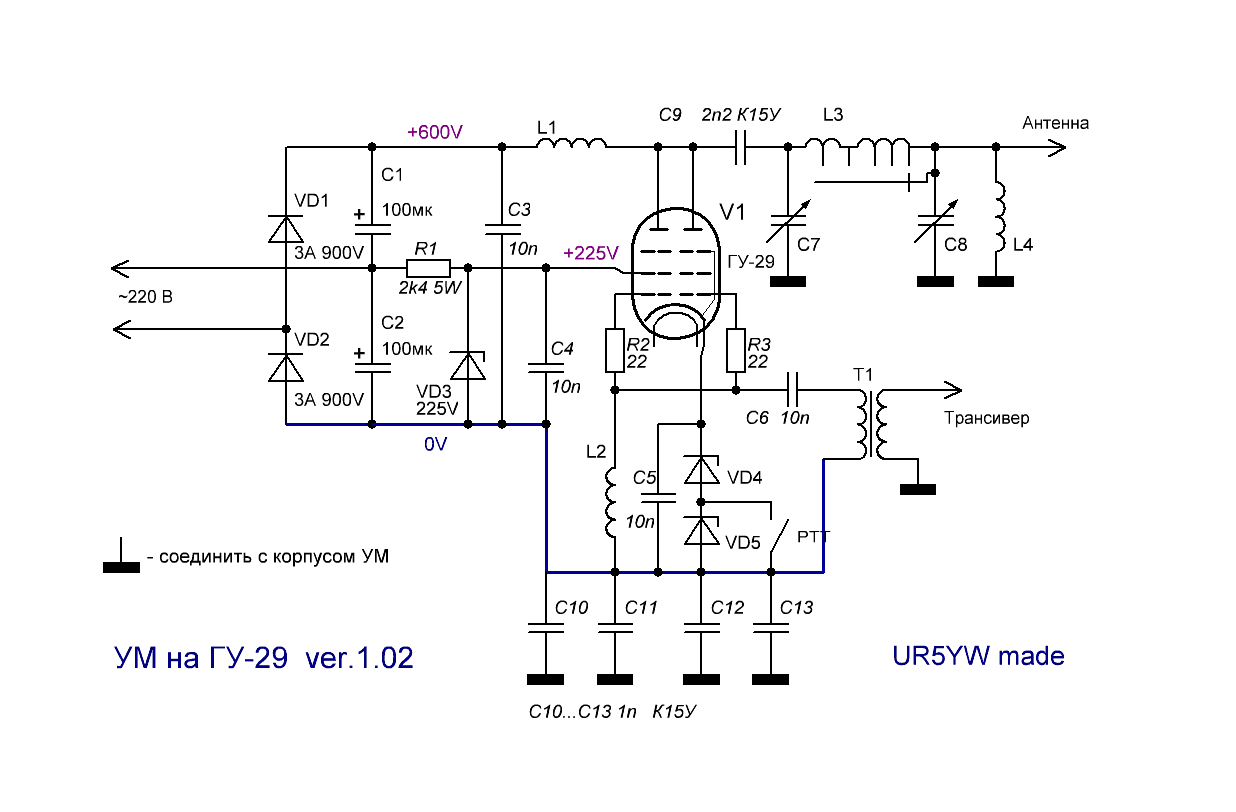 На першій сторінці форуму кульковою ручкою намальована. От саме по ній і робив. Так вийшло, що раніше я зробив підсилювач на 2 ГУ29 за описом RV4LK (підсилювач для SDR-1000) і працював він у мене з трансивером ЄФІР. А коли купив сучасний апарат то і валявся у мене той підсилювач без діла... От я і переробив його на 4 ГУ29 щоб корпус використати, бо жалко роботи було - багато отворів насвердлив в кришці :-) А взагалі то корпус малуватий, тісно мені було трохи. Але хотілось експериментів довгими зимовими вечорами (коли світло давали) да і допомогае відволіктись трохи від сьогодення.