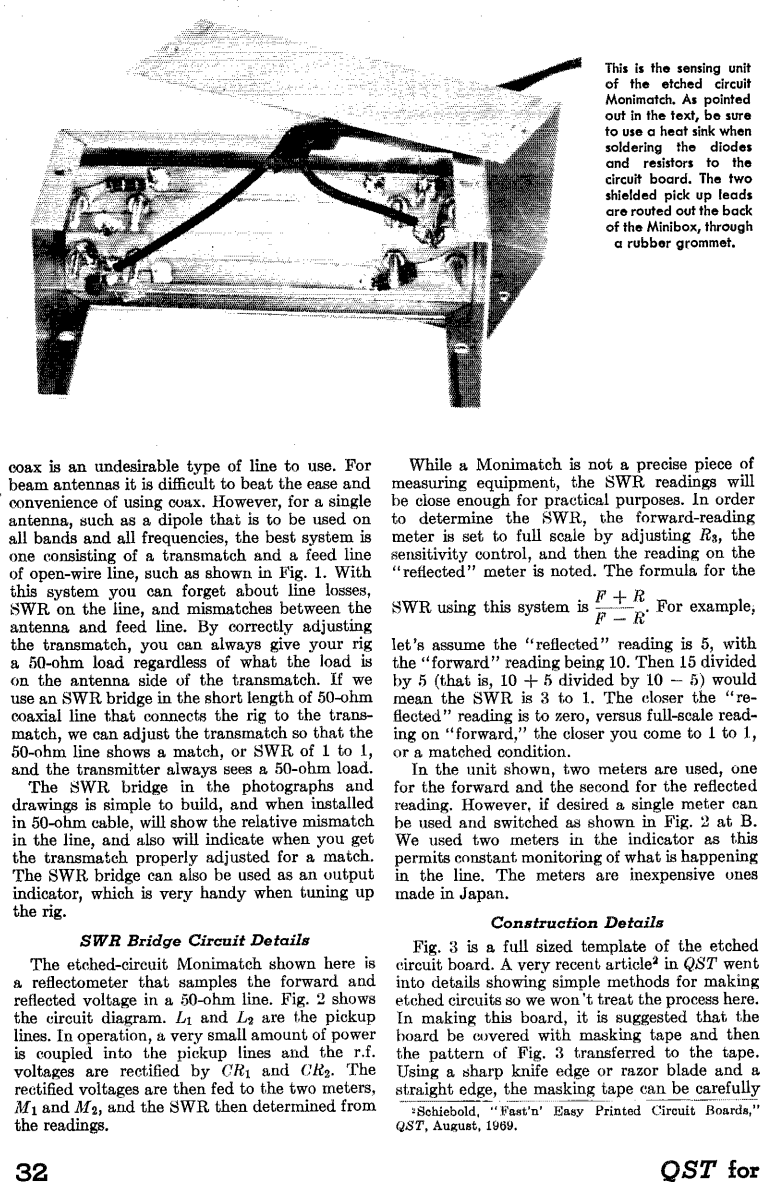 Оригінал в QST за жовтень 1969 року, стаття L. McCoy W1ICP “An Etched-Circuit Monimatch For Checking Your Antenna System”.