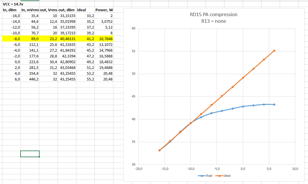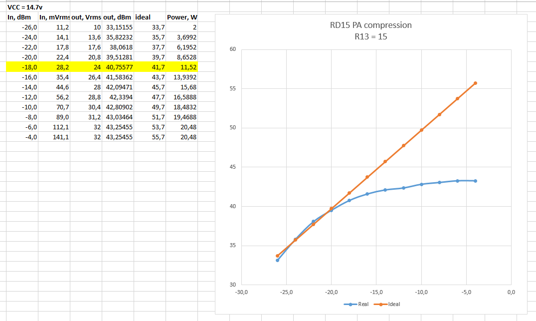 При живленні 14,7в максимальна потужність на виході 20Вт при вхідної напрузі 100mVrms (300 mVpp). Але це не досить файно бо вже на рівні 40-50мв на вході починається компресія. При цьому вихідна потужність становить 15Вт. Тобто підсилювач вийшов досить чутливий. Якщо така чутливість не потрібна то її можна зменшити поставивши замість Т3 трансформатор з обмотками 1:1. Це зменшить чутливість у двічі. Також регулювати підсилення можна резистором R13 - якщой його збільшувати то підсилення буде падати. Якщо його взагалі прибрати то підсилення зменшиться у 4 рази.