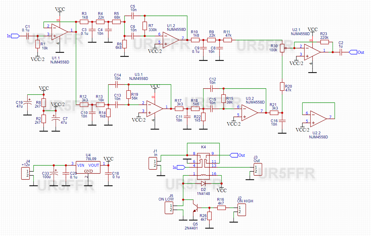У чому суть - смуга SSB 3кГц, але спектр людського голосу досить нерівномірний та обмежений. Якщо зробити фільтр який виріже усе зайве то він буде працювати як шумоподавлювач. Ідея не моя - схема взята з HamRadio Magazine 1/1980 (стаття в атачі). Трохи поправлені номінали з контролем АЧХ.