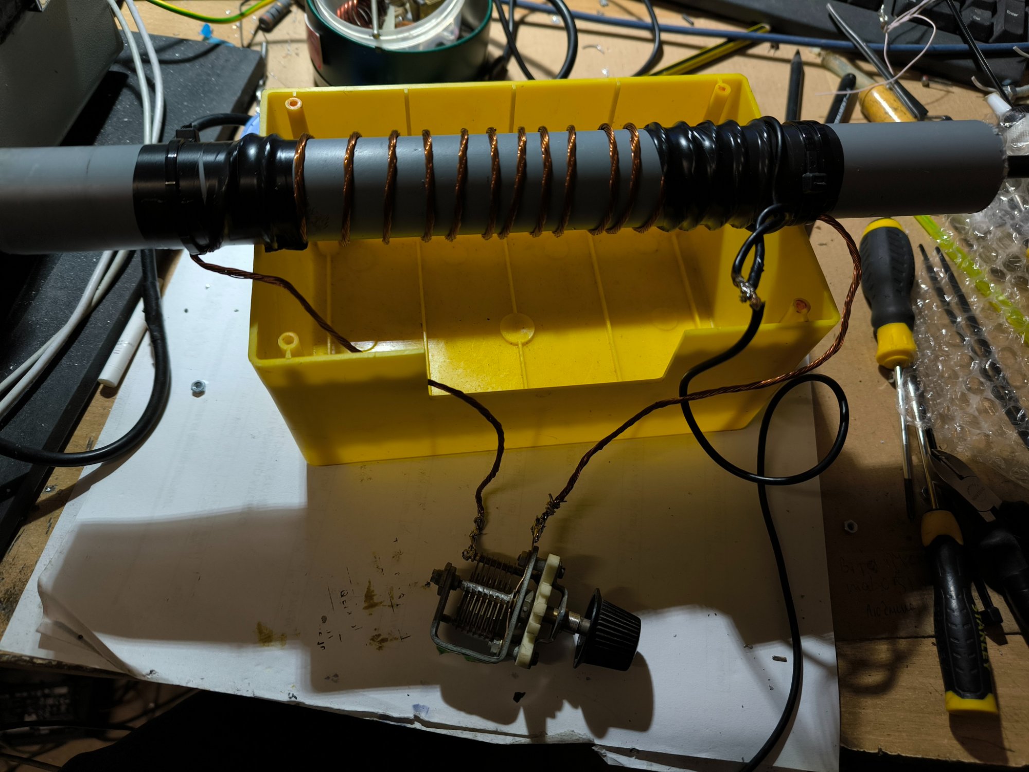Феритова антена на данний момент складається з 11(скільки було) стрижнів діаметром 8 мм і довжиною 16,проникність 400НН(стандартні від радянських приймачів)...із стрижнів зробив два пучки в одному 6 в іншому 5 стрижнів.їх скріпив навколо текстолітової трубки такого ж діаметру,цю конструкцію помістив в сантехнічну трубку.Основна катушка має 17 витків літцендрату (13*0,42),змінний конденсатор від 10до 53пф.Катушка зв'язку 4 витки (мідним дротом 2,5 кв)...
