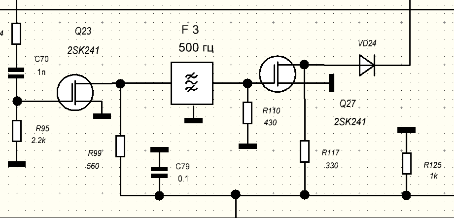Цей фільтр в приймальному тракті: По виходу фільтра бачимо навантаження 430 Ом, що дорівнює вихідному опору фільтра. Далі ізольований затвор польового транзистора який на узгодження не впливає. Тут все зрозуміло.