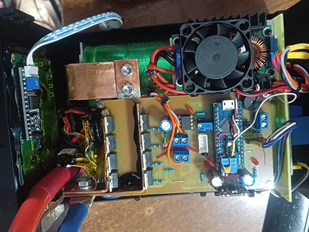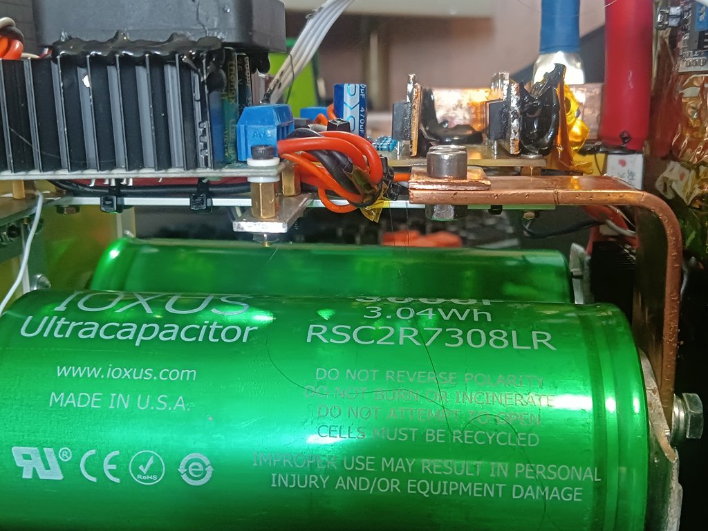 Зібрав я собі ось такий апарат щоб до кумулів стрічки варити а не паяти. Варить просто відмінно претензій нема. Проблема в індуктивному викиду від самих проводів. На виході стояло 3 супресора 1.5KE16CA жили вони до того моменту доки одного разу "не дожав" електродів до банки акумолятора і як результат загорілася дуга і супресори пали смертю хоробрих. Наступний раз я в же 5 шт в паралель вліпив цих супресорів і снабер в місце де підєнуються проводи у корпусі. І знову аналогічна ситуація, хоча іскри практично не було але рука у момент спрацювання зіскочила і в корпусі почувся постріл, однин супресор розірвало інші в пробої. Воно то і без них працює але лячно за транзистори, зібрано так що міняти їх там взагалі не варіант легше мабуть виготовити нову плату і зібрати ще раз. Транзистори у мене IRFB7430 8шт у паралель. От тепер питання про захист: