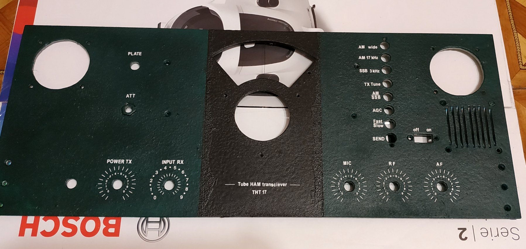 Також втавлю своїх 5 коп. Метод Андрія, звичайно, шикарний, але нерівності корпуса трохи видають себе навіть через фарбу. Я в свому трансивері зробив інакше. Передня панель в мене - металічна. На ній є пару місць кріплення гвинтів під потай, щоб не виступали спереду. Потім друкується картинка з написами і отворами під ручки, дисплеї на папері і ламінується з обох сторін. Чого з обої, бо якщо з однієї, то потім листок зкручується в трубку і є проблеми з його вирівнюванням. потім ця картинка вирізається ножицями з запасом, щоб краї загнути і зховати під боковими кришками. Для полегшення згинання, я обережно гострим лезом скальпеля зняв нижній шар ламінування в місцях згину на краях картинки. Посередині ламінування залишив з обох боків, тільки отвори вирізав. Там де дисплей - також повторив процедуру зняття нижнього шару ламінування і загнув за металічну передню панель. Вийшла гладенька кромка, без проглядання металу. Саму картинку до панелі приклеїв на тонкий двосотронні сктч в декількох місцях, там де нема ручок.