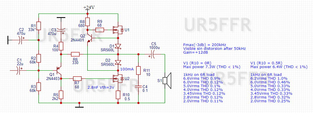 Це цілком робоча схема. Вона потребує двох однакових MOSFETів. Діоди D1D2 - Шотткі, це принципово. Струм покою зменшився до 100мА. Максимальна вихідна потужність зросла з 5,6Вт до 7,3Вт. Але збільшилися і спотворення.