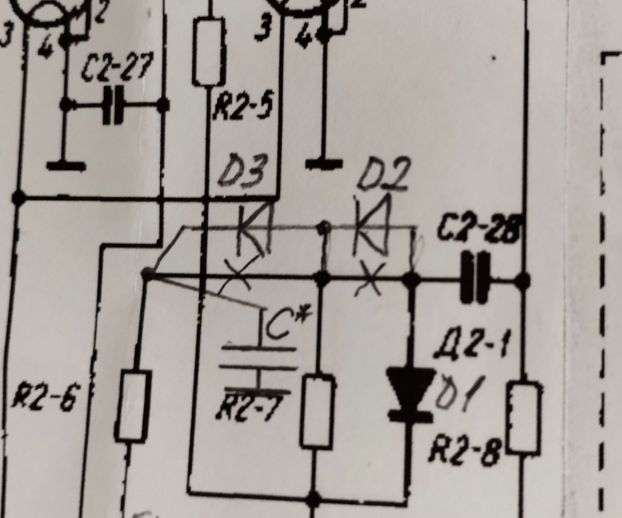 Що робимо: вилучаємо з монтажної планки штатний діод Д2Е (Д2-1) та дротяну перемичку яка з’єднує анод Д2-1 з відводами R2-6,R2-7. Відповідно до наведеної схеми монтуємо елементи призначення яких: Д1(був Д2-1) та Д2 - власне й є детектор з подвоєнням напруги. Стосовно Д3 та С* - окремо.