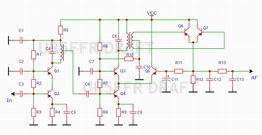 Ось приблизний вигляд ППЧ з АРП та АМ детектораНа емітерах Q5Q6 напруга така ж сама як на емітері Q3. Тому Q5 закритий. Коли з'являється сигнал Q5Q6 його випрямляють та Q5 починає відкриватися, що зменшує підсилення. Глибина АРП десь 60дб. Варіант дуже чорновий, тому без претензій
