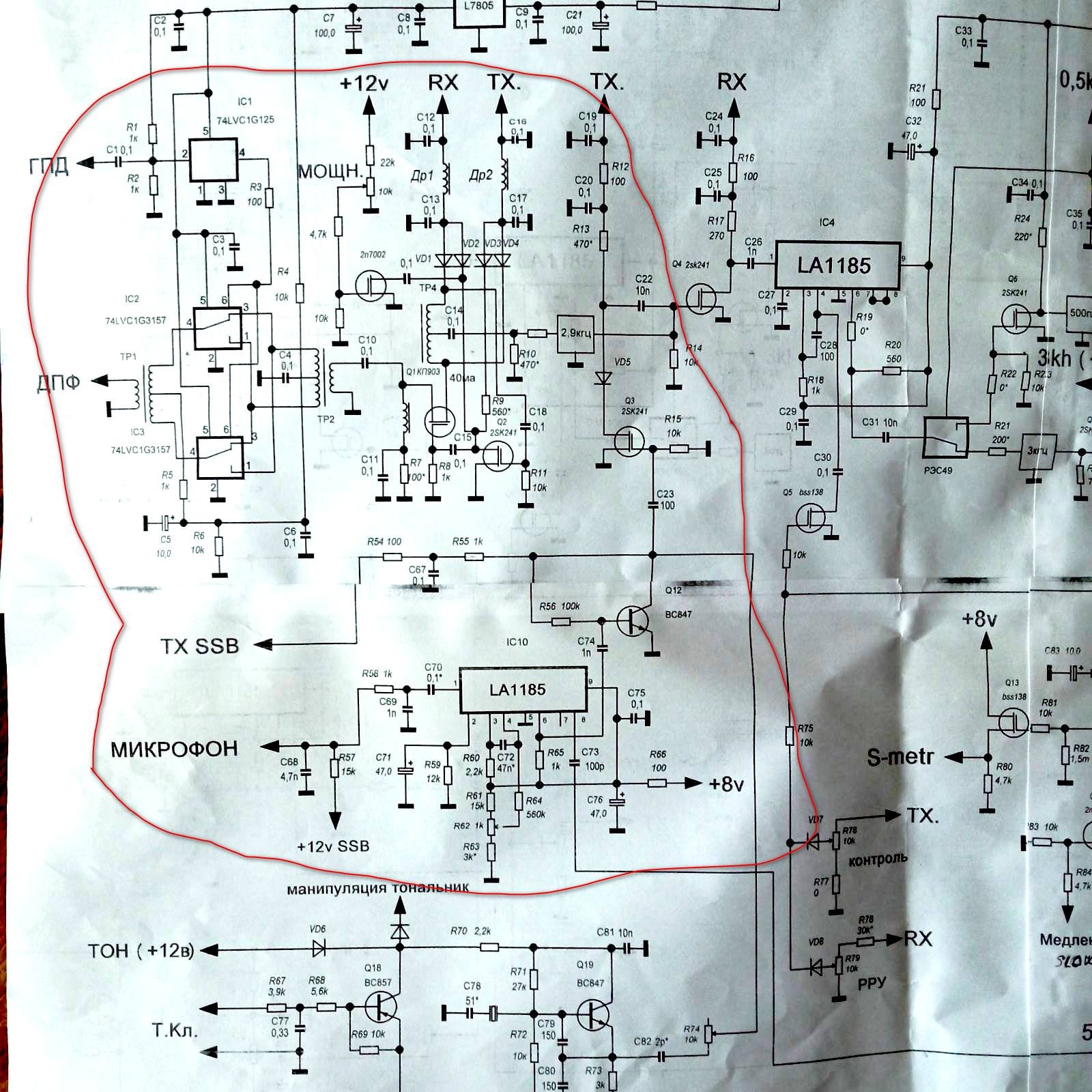 Вітаю, шановне товариство. Все ще працюю з даним апаратом. По прийому питань нема. А от з передачею проблема. Для підсилювача потужності не вистачає розкачки.    На виході основної плати рівень 160мВ р-р, тобто амплітуда 80 мВ. Чутливість підсилювача потужності 0,14В амплітудного ( 0,28В р-р). Спроба добавити ще один каскад до підсилювача ( в самому підсилювачі) не має успіху. З допоміжним, п'ятим каскадом,   від 1,8 МГц до 14 МГц все чудово, але після 14 МГц ( 18-30 МГц) підсилювач стає нестабільним. Чи можливо збільшити вихідну напругу в схемі основної плати трансивера, якщо так, то як? На схемі червоним обведена ділянка, що відповідає за передачу. Чи може спробувати добавити каскад перед полосовими фільтрами?