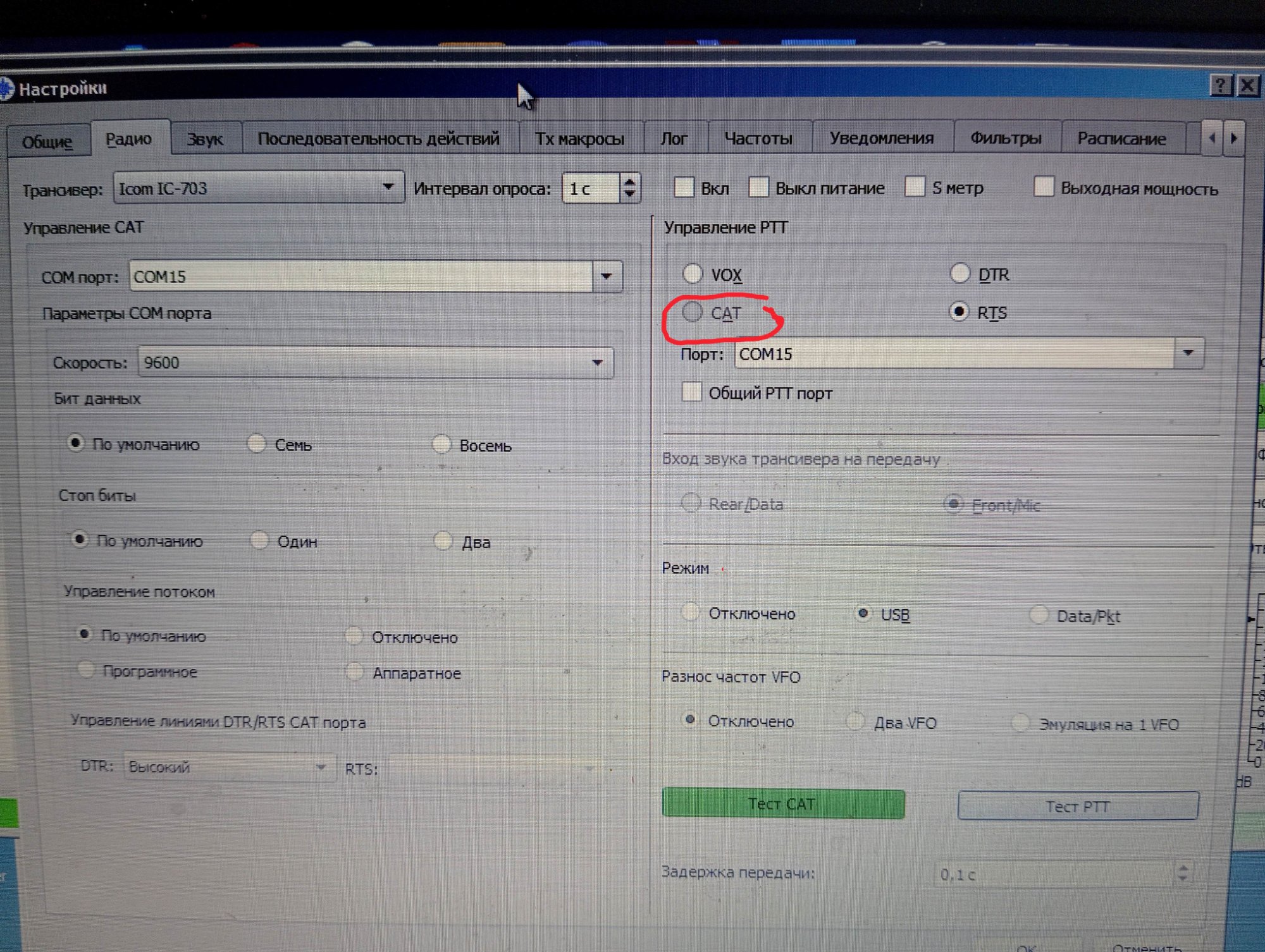 Методом научного тика знайшов настройку вмикання передавача. На фото внизу зліва є "управление линиями DTR RTS cat порта". Там де dtr  треба ставить рівень "пусто".  :shock: