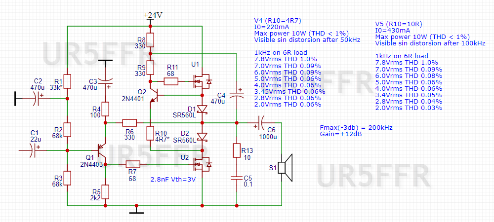 У останній схемі з двома діодами можливо регулювати струм спокою зміною резистора R10. Якщо збільшити його з 4.7ом до 10ом то струм зросте з 220мА до 430мА