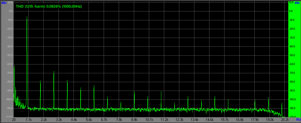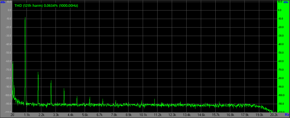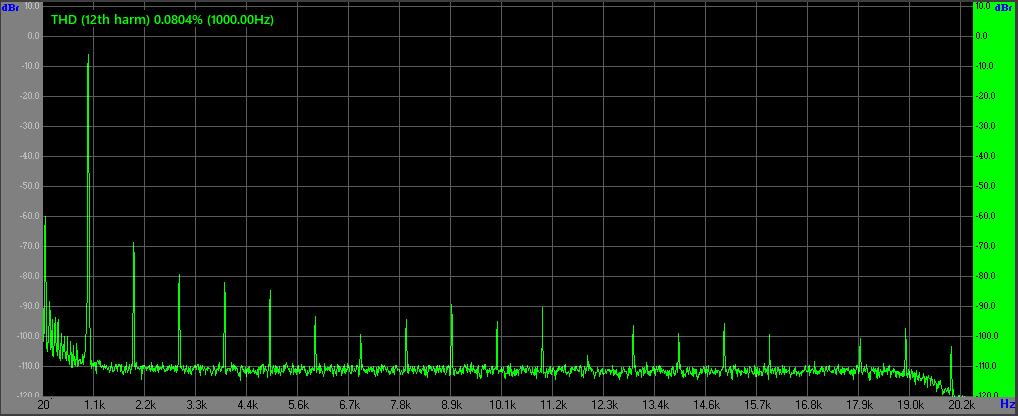 Спотворення трохи зменшилися на малих рівнях гучності 2-2,8Vrms (1-1,5Вт) бо тут підсилювач працює майже у чистому класі А - тертя гармоніка або відсутня або рівень її на 15-20дб нижчий за другу.