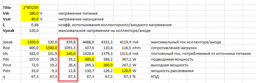 Все понятно. А як розуміти Ipeak = 439.8 мА, коли по даташиту ток катода однієї лампочки 100ма, двох відповідно 200. Якщо ж керуватися по максимально розсіюваній потужності, то на одну лампочку 10 ватт, тобто разом 20, підставляємо і маємо вихідна потужність 41ватт, ток анода 686мА, постійний ток 218мА... Воно не сплавиться?