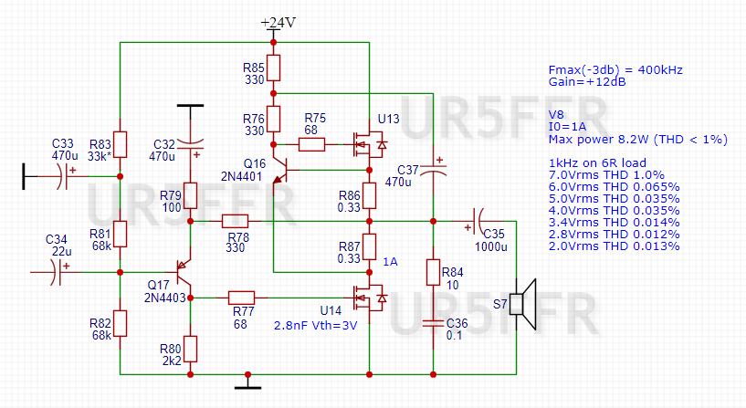 До речі цікавий момент у цій схемі - струм спокою не залежить від температури. Геть зовсім ніяк :) Також обидва транзистора ніколи не закриваються повністю. Тобто немає відсічки. І нема спотворень пов'язаних з цим