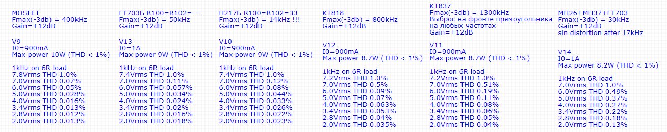 КТ818 та КТ837 мені зовсім не не сподобались - брудний спектр, лізе третя гармоніка, самозбуд. П217 дуже низькочастотний - він начебто й дає непогані результати на частоті 1кГц але дуже швидко деградує. ГТ703 якщо розкачувати кремнієм то непогано, майже на рівні мосфетів. Якщо усе перевести на германій то починаємо слухати другу гармоніку і отримуємо "германієвий" звук.