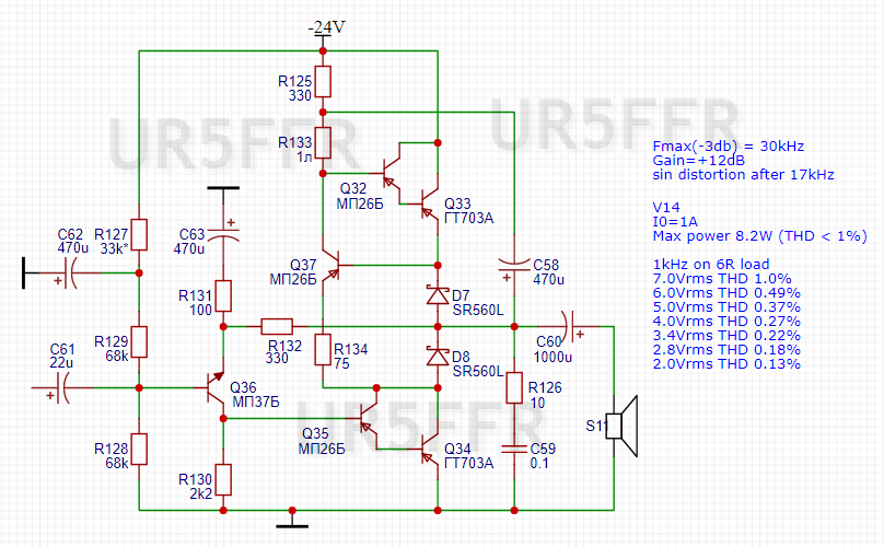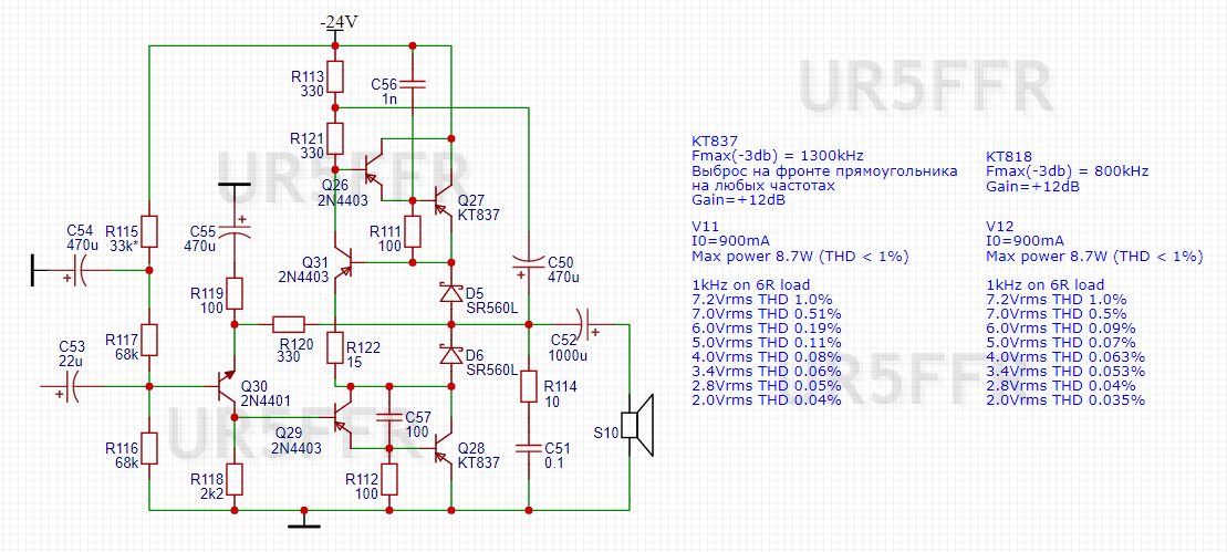 Довелося у вихідному каскаді використовувати складові транзистори по схемі Дарлінгтона, бо інакше суттєво зменшується максимальна вихідна потужність через низьку бетту силових транзисторів. С56С57 потрібно бо інакше є самозбудження на ультразвуку. У КТ837 дуже брудний спектр. КТ818 від нього не далеко відійшов.