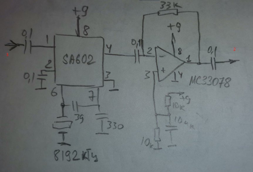Міксер 602 (або 612) ввімкнено по класичній схемі, добавити нема що, також і половинка ОП виконує роль простого підсилювача. У випадку самозбудження можна зменшити резистор між виводами 1 та 2, та шунтувати його конденсатором на 30-50 пФ). Сигнал на вхіл (т1) подаємо з виходу підсилювача ПЧ трансивера, (правий по схемі вивод L1).Виход перетвореного та підсиленого сигналу суб-ПЧ (192КГц) подаємо на наступний каскад:
