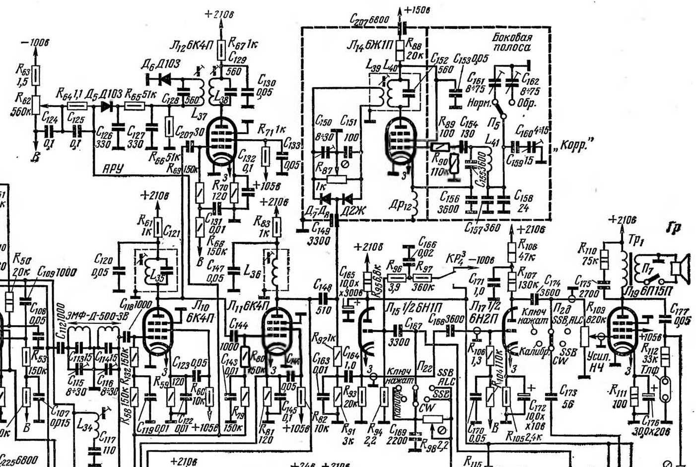 В цій схемі доволі незвичне схемне рішення балансного модулятора. Ніколи більше ніде не бачив. Цікаво,наскільки ефективно він працював?