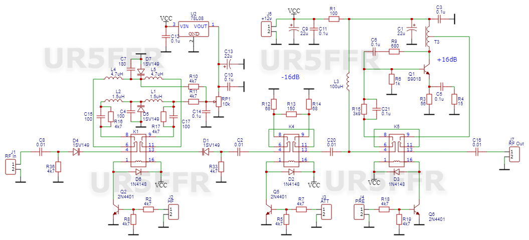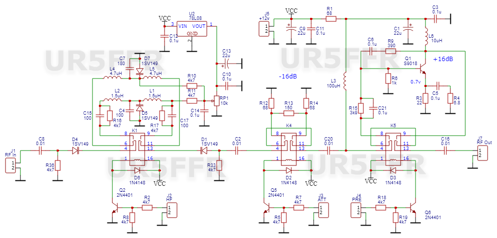 На платі преселектора з попереднього поста є одна невеличка "вєсчь" яка псує увесь феншуй. Це трансформатор у ПВЧ, бо його потрібно мотати. Отже було вирішено його замінити на дросель. Якщо міняти без перерахунку каскаду то впаде динаміка та зміниться вхідний опір. Тому підсилювач було перераховано, струм збільшено майже у два рази - до 30мА. По моїм вимірюванням точка компресії не змінилась та становить P1db = +1dBm (IIP3 = +14dBm)Дросель 10uH - звичайний "смугастий". R4 6.8ом зроблено з двох резисторів уключених паралельно з номіналами 12ом та 15ом. В решті схема не змінилась.