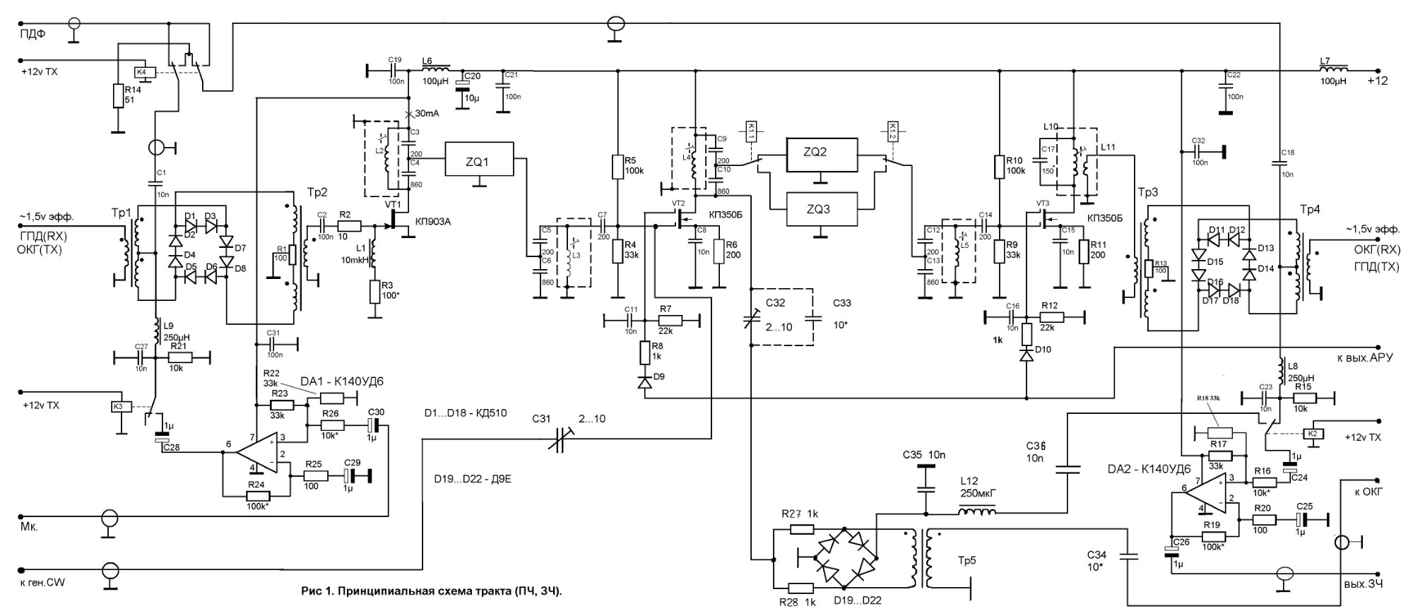 Де поділося обмеження сигналу при передачі яке було в оригінальному тракті? Його нема. Що з АРП? Спростили. Ну то таке - кому що подобається. Але куди підключати АРП? На схемі про це ні слова. Кудись. Ну ок, кудись підключимо. Начебто усе гаразд? Ні. Бо коли ми переходимо в режим передачі то ППЧ потрібно запирати - його підсилення забагато. У М'ясникова це робиться, а тут - ні. Які КФ тут використовуються? Який імпеданс? 100ом? 500ом? Нема ні слова.