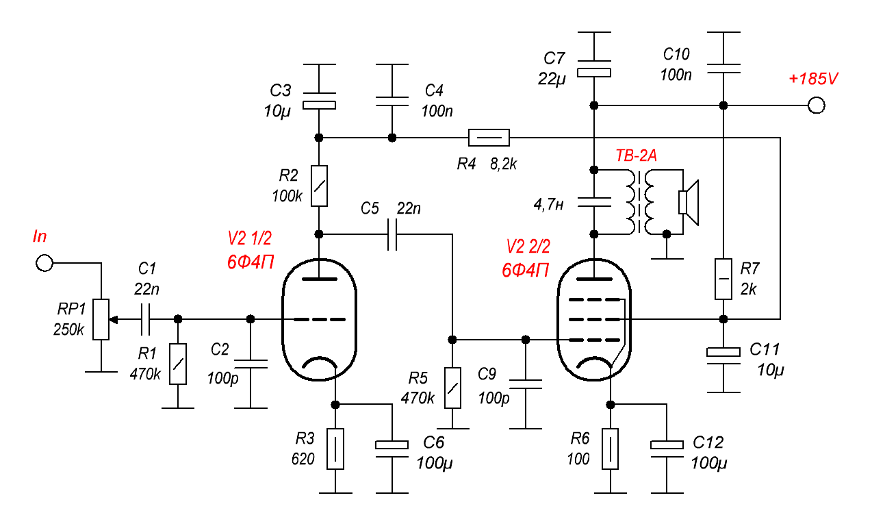 Побудовано на лампі 6Ф12П. Тріод включено по схемі з ОС. Чому так? У тріода низький рівень шуму, але висока прохідна ємність. У схемі з ОС буде краще розв'язка та вище підсилення. На виході включено другий фільтр, бо один фільтр не дозволяє получити гарантованого задовільного подавлення по сусідньому каналу.