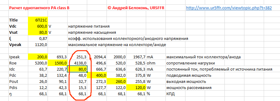 Далі беремо у мене на сайті рахувалку каскаду у класі В. Ставимо постійний струм на 20% менше максимального (100мА). Roe =~ 4k. На виході 32Вт, у тепло йде 15Вт - по даташиту не перевищуємо максимальну 18Вт.