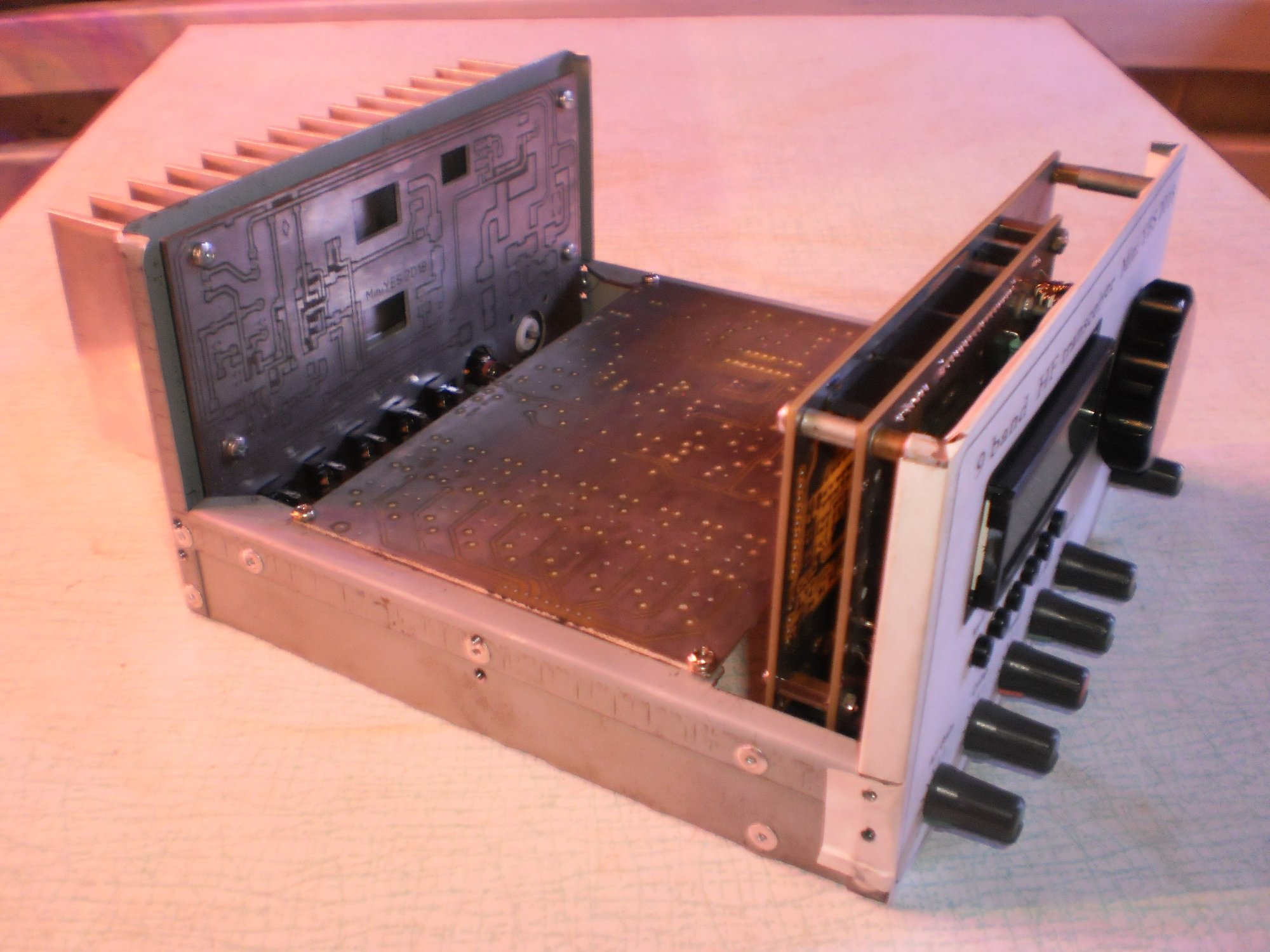 Також втавлю своїх 5 коп. Метод Андрія, звичайно, шикарний, але нерівності корпуса трохи видають себе навіть через фарбу. Я в свому трансивері зробив інакше. Передня панель в мене - металічна. На ній є пару місць кріплення гвинтів під потай, щоб не виступали спереду. Потім друкується картинка з написами і отворами під ручки, дисплеї на папері і ламінується з обох сторін. Чого з обої, бо якщо з однієї, то потім листок зкручується в трубку і є проблеми з його вирівнюванням. потім ця картинка вирізається ножицями з запасом, щоб краї загнути і зховати під боковими кришками. Для полегшення згинання, я обережно гострим лезом скальпеля зняв нижній шар ламінування в місцях згину на краях картинки. Посередині ламінування залишив з обох боків, тільки отвори вирізав. Там де дисплей - також повторив процедуру зняття нижнього шару ламінування і загнув за металічну передню панель. Вийшла гладенька кромка, без проглядання металу. Саму картинку до панелі приклеїв на тонкий двосотронні сктч в декількох місцях, там де нема ручок.