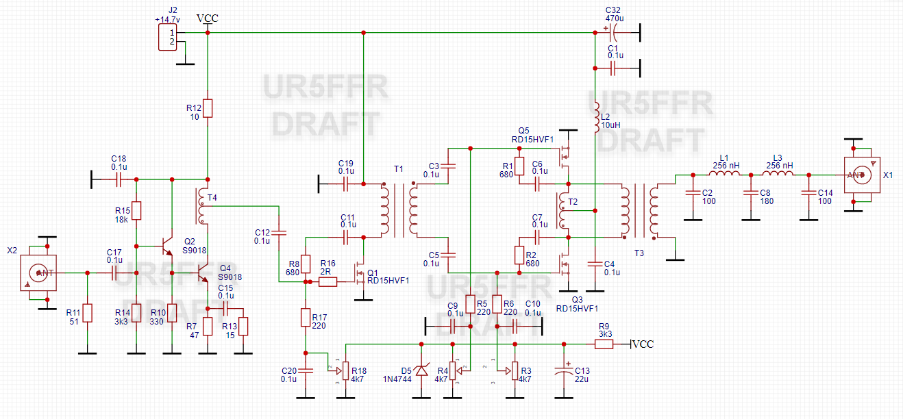 Бачите на схемі написано DRAFT, тобто чернетка. Поки що нічого не даю бо схема тестується та уточнюється. Зелені кільця купувалися в Радіомагі - вони там є.Maksym писав: ↑Вів грудня 16, 2025 9:04 am Вітаю! Хочу повторити цей PA. Чи не могли б ви уточнити намотувальні дані трансформаторів (T1 Т2 T3 і Т4 - проникність кілець та кількість витків)?