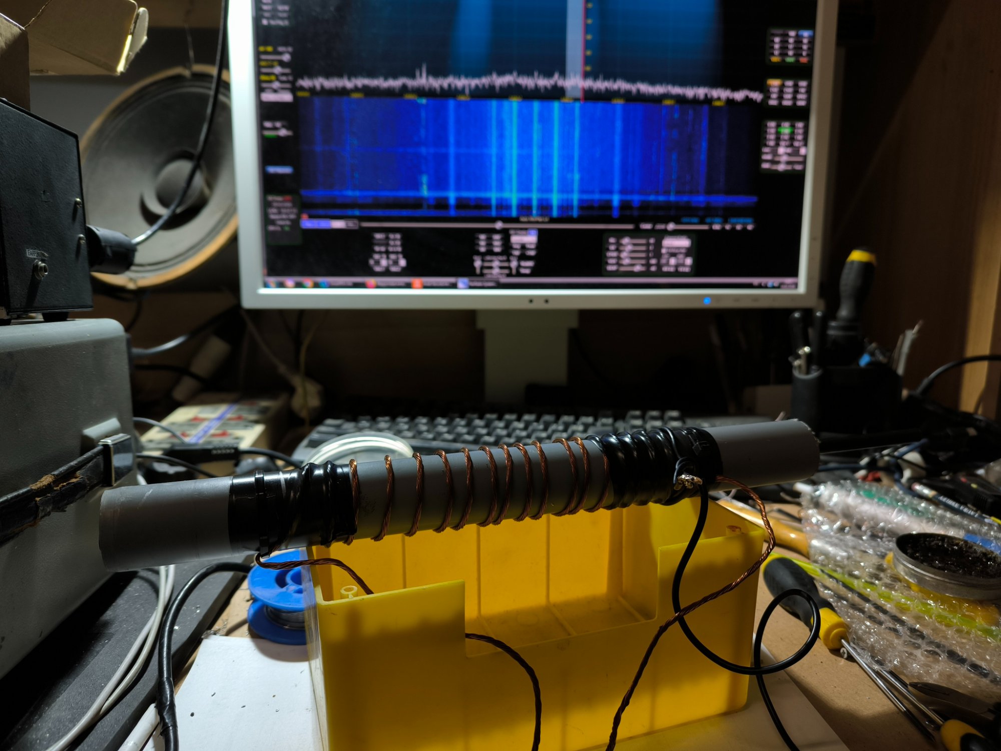 Феритова антена на данний момент складається з 11(скільки було) стрижнів діаметром 8 мм і довжиною 16,проникність 400НН(стандартні від радянських приймачів)...із стрижнів зробив два пучки в одному 6 в іншому 5 стрижнів.їх скріпив навколо текстолітової трубки такого ж діаметру,цю конструкцію помістив в сантехнічну трубку.Основна катушка має 17 витків літцендрату (13*0,42),змінний конденсатор від 10до 53пф.Катушка зв'язку 4 витки (мідним дротом 2,5 кв)...