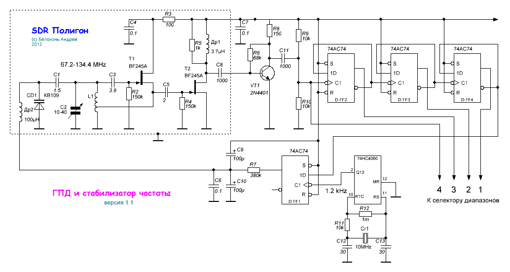 Цікава схема коли використовуємо лише параметричну стабілізацію частоти бо гетеродин завжди працює на відносно низький частоті 4-6МГц. Але якщо задіяти ЦАПЧ у будь якому вигляді то підставку робити не треба - гетеродин може працювати одразу на потрібній частоті. Наприклад у мене він працює у діапазоні 60-120МГц і частота стоїть як укопана.