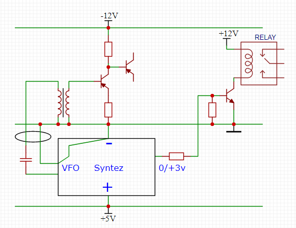 Четвертий варіант - залишити в спокої аналогову частину. Живлення зробити -12в. А ось синтез перевернуті догори ногами. Тобто його "землю" під'єднати до -12, а плюс - до землі. Тоді він буде видавати сигнали -12 (це нуль для нього) та -9 (це його 3,3в). Ставимо МП37, емітер до -12в, на базу сигнал управління -12в/-9в, у колектор - реле другим кінцем на землю