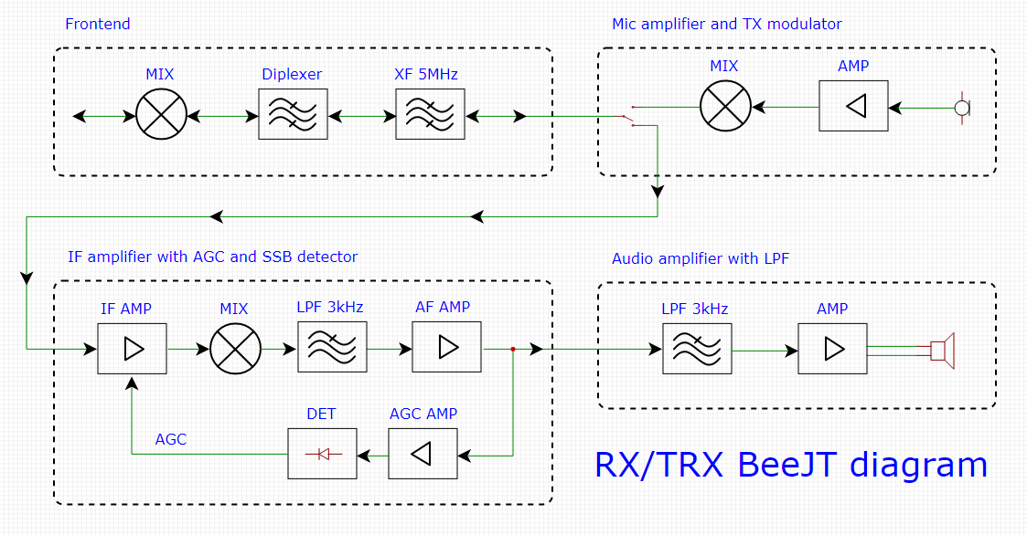 Змішувач діодний, після нього діплексер, двонаправлений підсилювач та кварцевий фільтр. Підсилювач схожий на каскади які використовуються у "клопіку", але на відміну від нього мають однакові вхідні/вихідні імпеданси. Живлення 6в бо при вищій напрузі стається пробій переходу (але транзистор при цьому не пошкоджується). Вхідний-вихідний опір цього блоки становить 50ом та легко узгоджується з ДПФ та підсилювачем ПЧ
