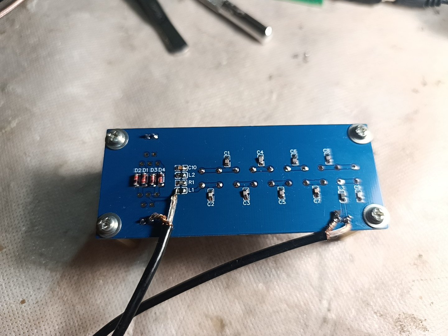 Тут додав паралельно до ємностей у фільтрі по 3,3пФ ємності з намірами трішки земеншити смугу пропускання, але щось пішло не так. Буду розбиратись