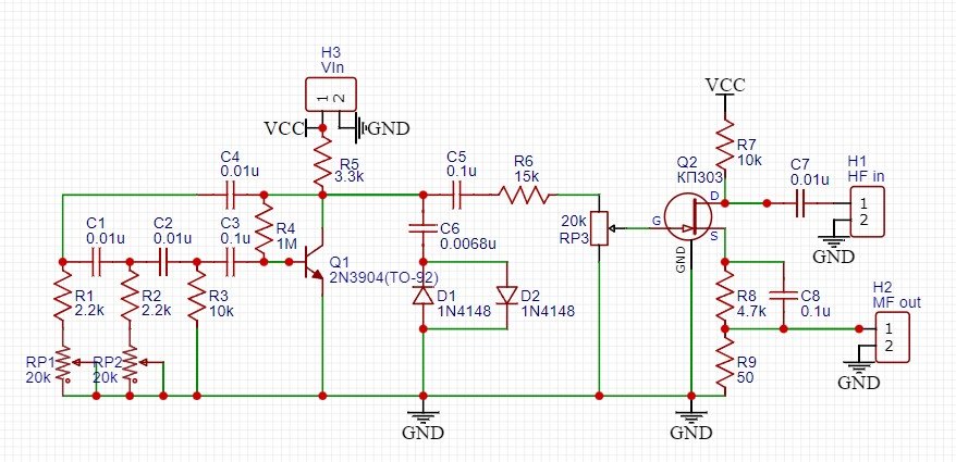 На транзисторі Q1 зроблений змішувач для АМ модуляції, де RP4 відповідає за регулювання глибини модуляції.