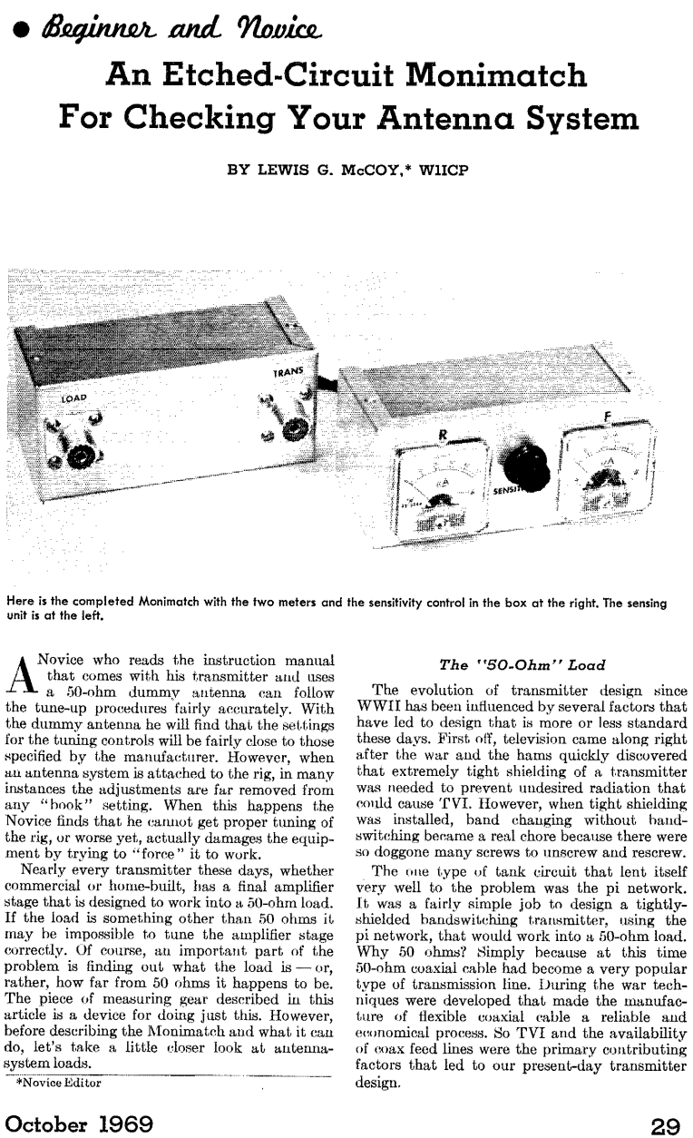 Оригінал в QST за жовтень 1969 року, стаття L. McCoy W1ICP “An Etched-Circuit Monimatch For Checking Your Antenna System”.